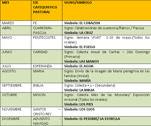 Durante el año escolar, las actividades académicas se refuerzan con “signos pastorales” se trata de imágenes y acciones que animamos para profundizar la comprensión de nuestra vida de fe en la Comunidad Educativa. Cada mes está guiado por un “signo” que debe ser recreado en cada ciclo, sala, grado y/o curso.